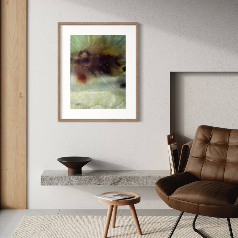 Dans cette palette de vert, de bleu et de gris au courbe arrondis, le vent vient disperser une infime partie, comme une présence éphémère. Ici, la naturalité peut être observée dans divers aspects, laissant toute sa place à l’imagination.